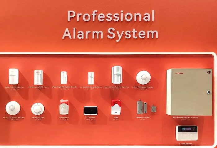 At booth SA-L41, the scene displayed 4G home security system, smart home sensor system, professional security alarm system, perimeter intrusion alarm system, access control system and other five systems.
