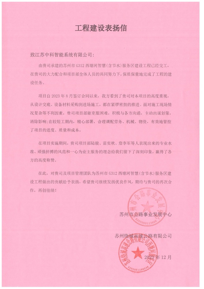 Recently, Suzhou highway development center and Suzhou ring highway to secure subsidiary zhongke intelligent joint letter of commendation, zhongke intelligence in the "Suzhou G312 xitang river wisdom (including water saving) service area construction project G312-ZHFWQ bid" recognized the overall work of the project, especially for the project department members in the process of professional standards, indomitable style and praised the concept of service for the owner.