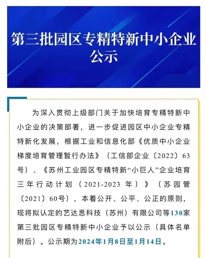 Recently, Suzhou Industrial Park in Jiangsu Province published the third batch of park special special new small and medium-sized enterprises list, Jiangsu Zhongke Intelligent System Co., Ltd. through layers of screening, among them, was awarded "park special special new small and medium-sized enterprises".