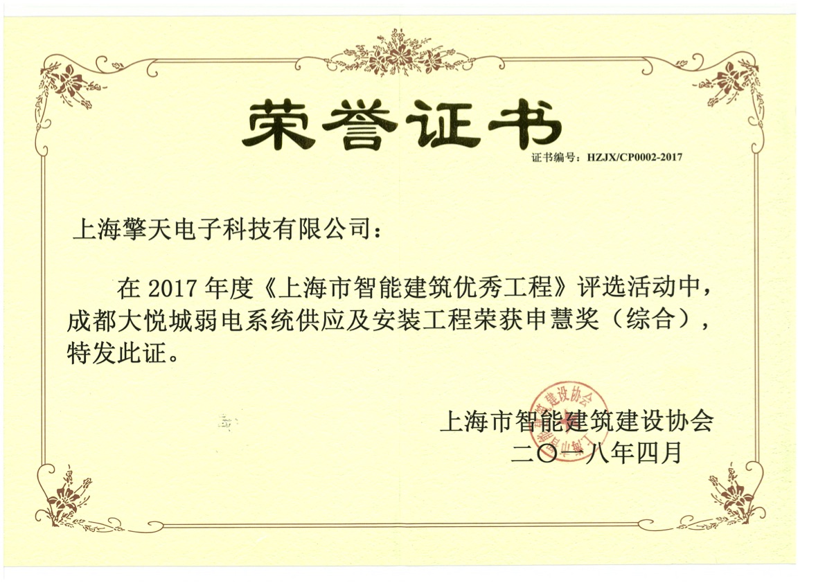 The project that promoted Shanghai Keenshine to get the Shenhui Award is the low voltage systems for Chengdu Dayuecheng Development, a project that adds a new medal to the company's wall of honors. In compliance with the innovative design requirements for modern intelligent buildings, this project contains a comprehensive cabling system, a video monitoring system, an invasion alarm system, a door access control system, a wireless offline patrol system, a parking lot management system, an IBMS integration system, an emergency broadcast/background music system, a business information release system, a UPS system, a wireless two-way communication system and an automatic building control system.