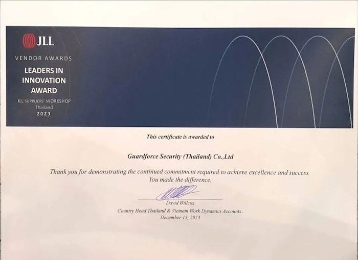 Recently, Guardforce Thailand, a subsidiary of China Anke, won the Outstanding Leader Innovation Award from the headquarters of Jones Lang LaSalle (Jones Lang LaSalle) Thailand.