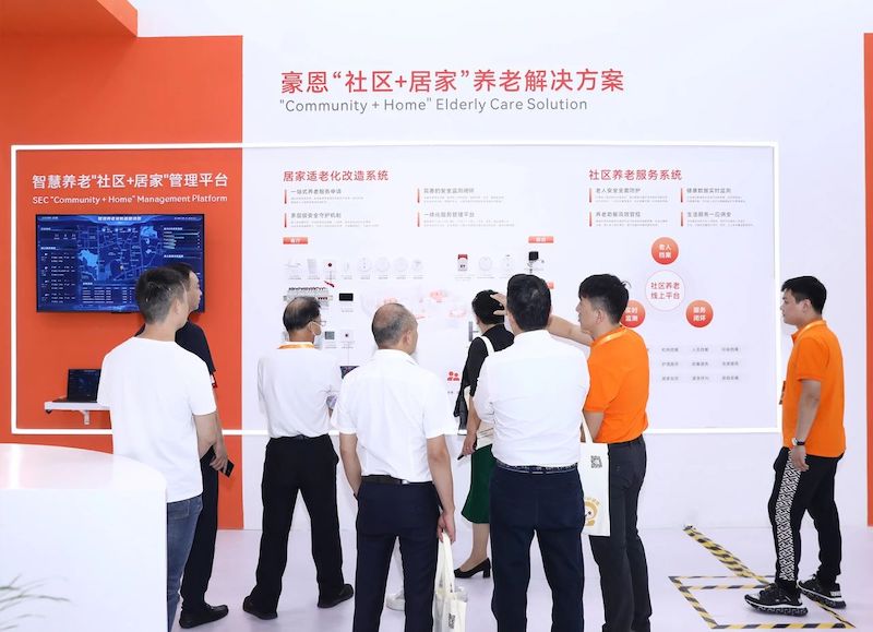在4號(hào)館4D60展位上,豪恩橙色展臺(tái)獨(dú)樹一幟,現(xiàn)場(chǎng)展示了智慧養(yǎng)老綜合管理平臺(tái)、社區(qū)+居家養(yǎng)老解決方案以及機(jī)構(gòu)養(yǎng)老解決方案三大展區(qū),吸引了行業(yè)內(nèi)眾多企業(yè)與專家參觀。