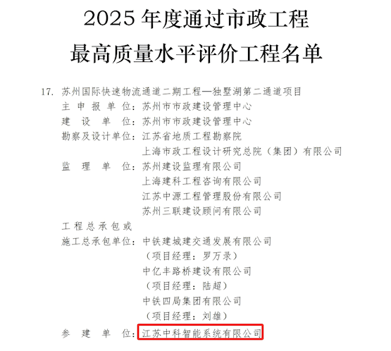 2025年7月22日,中國市政工程協會公布評選結果,中安科子公司江蘇中科智能系統有限公司(以下簡稱“中科智能”)參建的蘇州國際快速物流通道二期工程-獨墅湖第二通道項目,榮獲2025年度市政工程最高質量水平評價工程。
