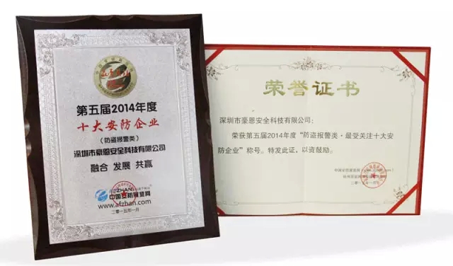 2015年3月16日,由中國安防展覽網主辦,備受業界關注的“第五屆2014年度最受關注十大安防企業頒獎盛典暨2015年安防新技術創新及成果研討會”在杭州召開,豪恩安防獲得“最受關注防盜報警類十大安防企業”榮譽稱號。