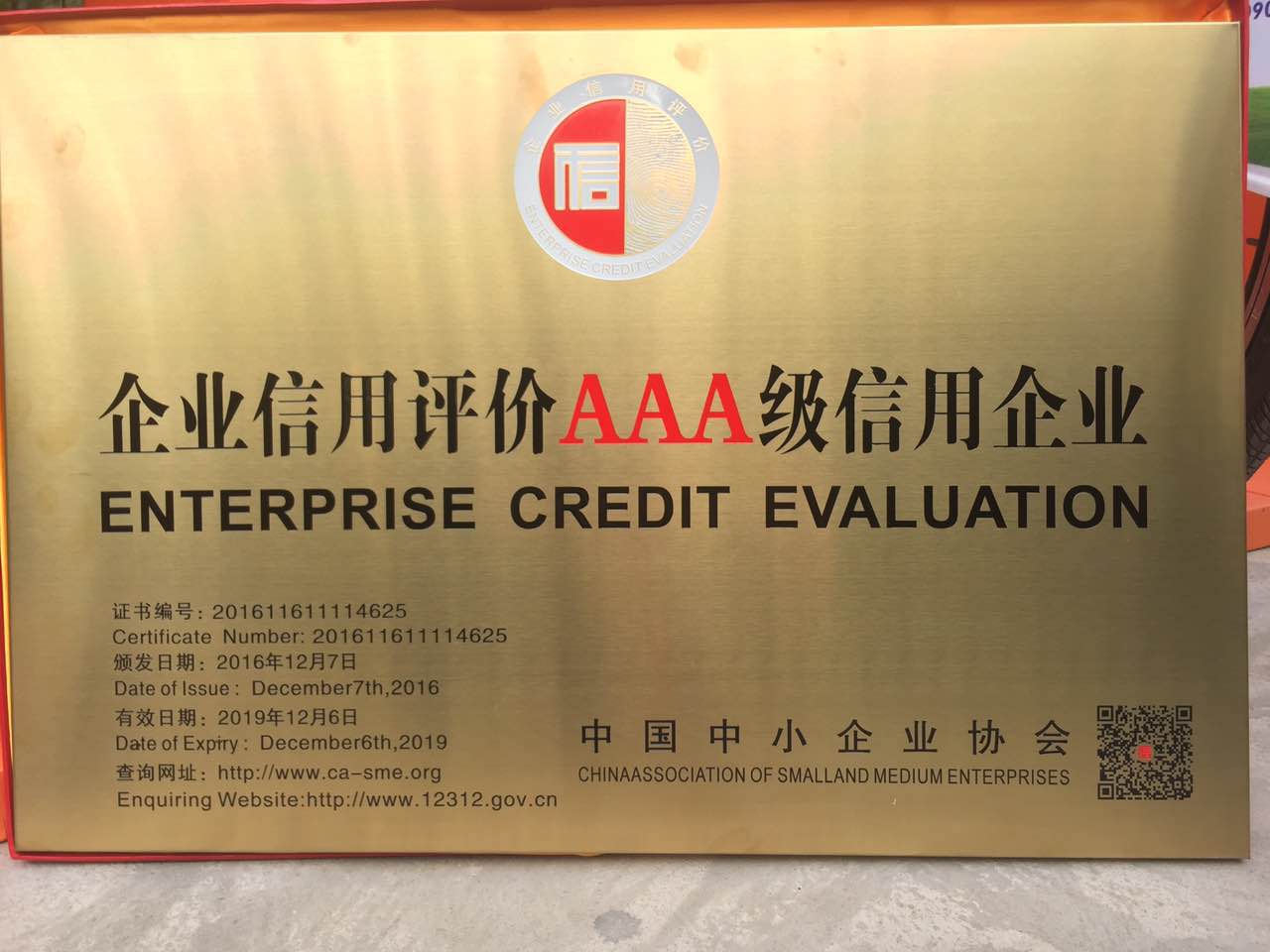 榮獲國家商務部“企業信用3A級” 評價