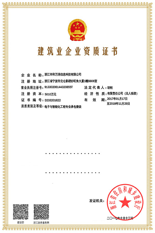 20171013日,中安科股份成員企業浙江華和萬潤信息科技有限公司(以下稱華和萬潤),經浙江省住房和城鄉建設廳核準和近一年的嚴格審核與評估,憑借自身強大的技術實力和優秀的業績背景,順利通過評審,成為電子與智能化工程專業承包一級資質企業。