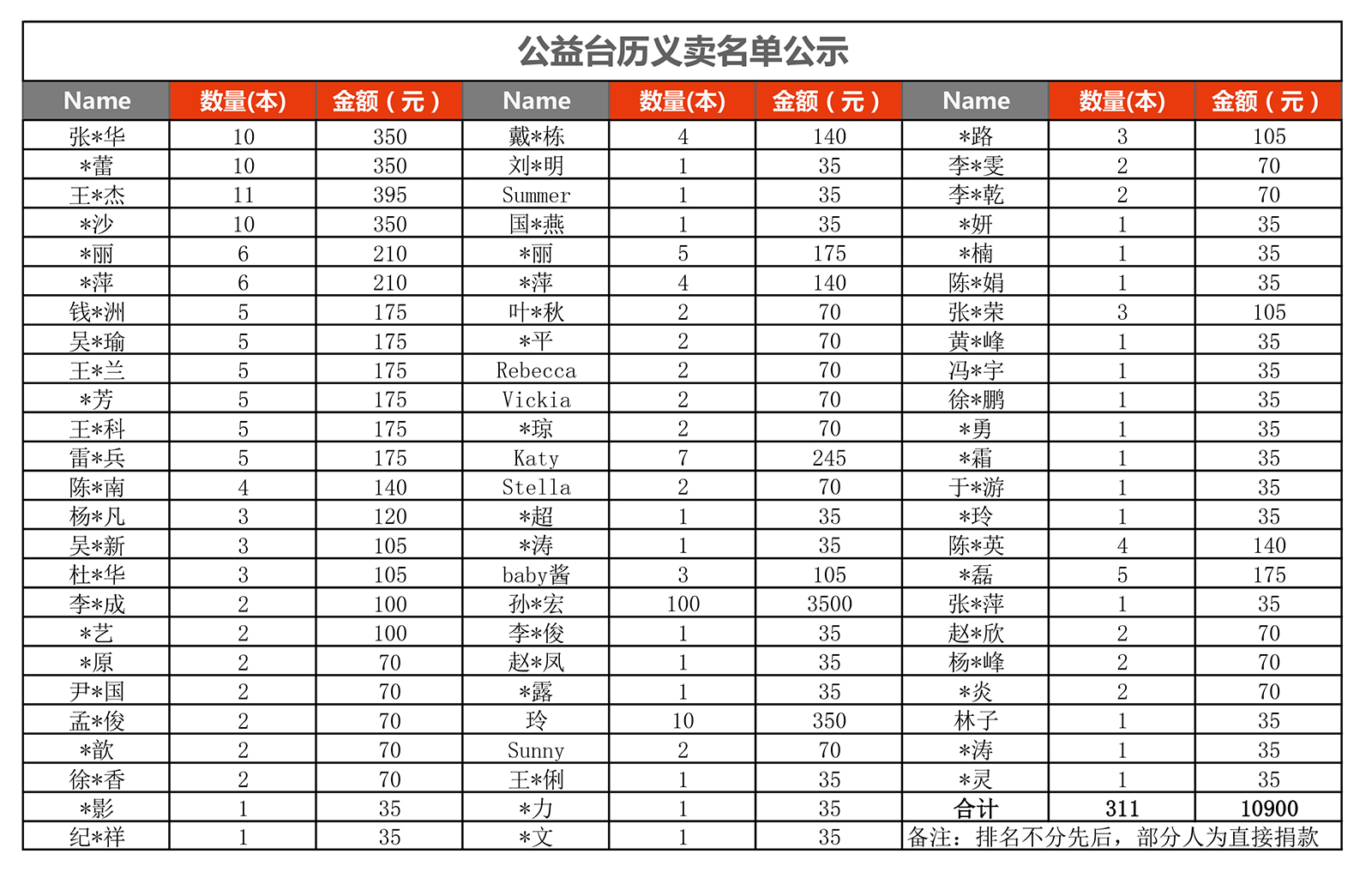 在此,我們衷心感謝感謝所有參與者,您的愛心讓“星星兒童”銘記于心。據統計,線上線下共有73名愛心人士購買臺歷,認購數量311本,捐款金額10900元,下表是公示記錄: