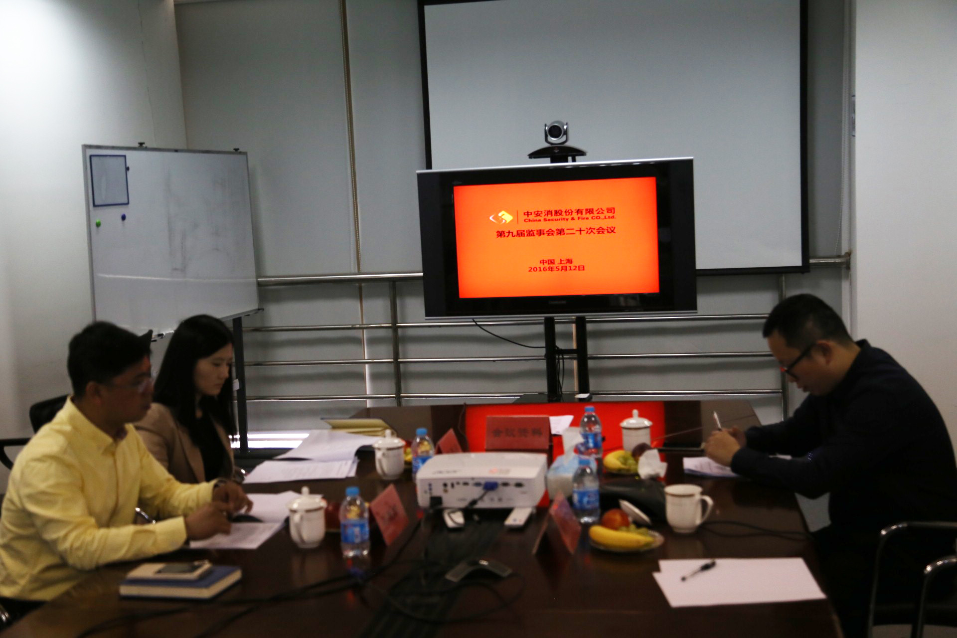 圖2,監事會會議現場,左排:監事:吳展新(左二)、陳亞南(左一);董事會秘書付欣(右一)。