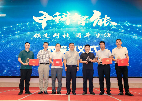 表彰大會上,由中安科股份公司副總裁兼江蘇中科智能總經理查磊先生為項目組成員、劉松峰、王永亮、朱浩頒發了獎杯、榮譽證書及感謝信。
