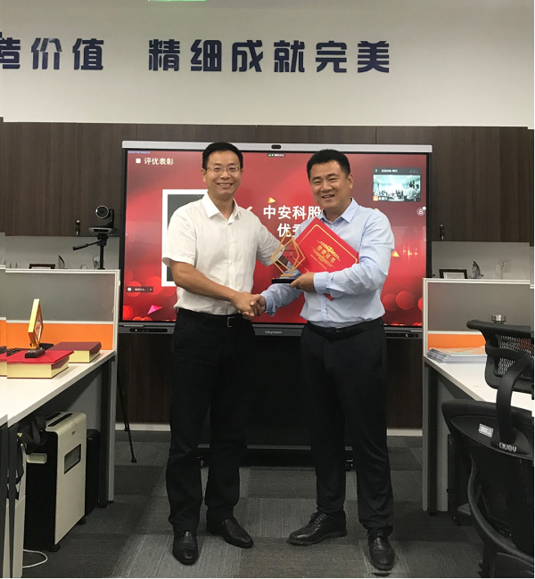 表彰大會上,由中安科股份副總裁兼深圳威大總經理李振東先生為優秀員工代表黃振財、李文浩頒發了獎杯、榮譽證書及感謝信。